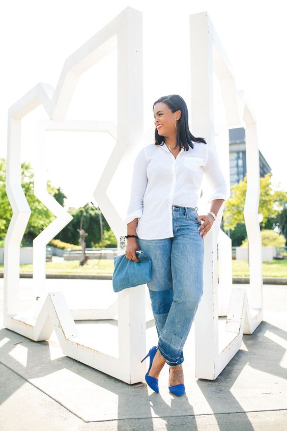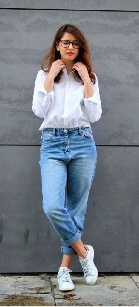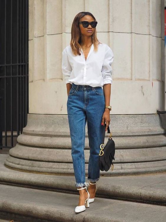 This picture is the epitome of urban chic, featuring a loose white shirt with a high-low hem tucked into relaxed blue jeans. The look is completed with classic sneakers, making it an ideal outfit for city explorations. To add a touch of individuality, consider a statement watch or a set of bangles that reflects personal style.