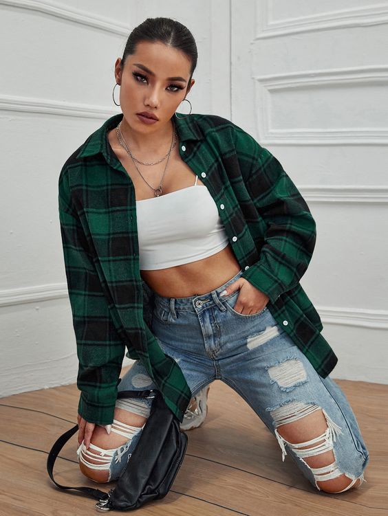A green plaid flannel shirt introduces a pop of pattern and color, worn open over a white cropped top, adding layers and texture to the look. The shirt complements the light blue, distressed boyfriend jeans, which offer both comfort and a hint of grunge. Women who love to blend feminine and rugged elements will appreciate this outfit. Opt for a minimalist leather backpack and some hoop earrings for a blend of practicality and style.