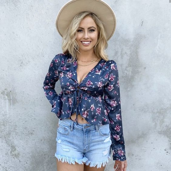The romantic flair of this outfit is undeniable, with a blue floral lace shirt tied at the waist, revealing just a hint of midriff above high-waisted denim shorts. This look is a beautiful blend of femininity and ease, perfect for a brunch or a casual date. Complete this charming outfit with simple accessories like a wide-brimmed hat to shade from the sun and add a touch of mystery.