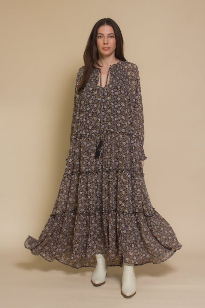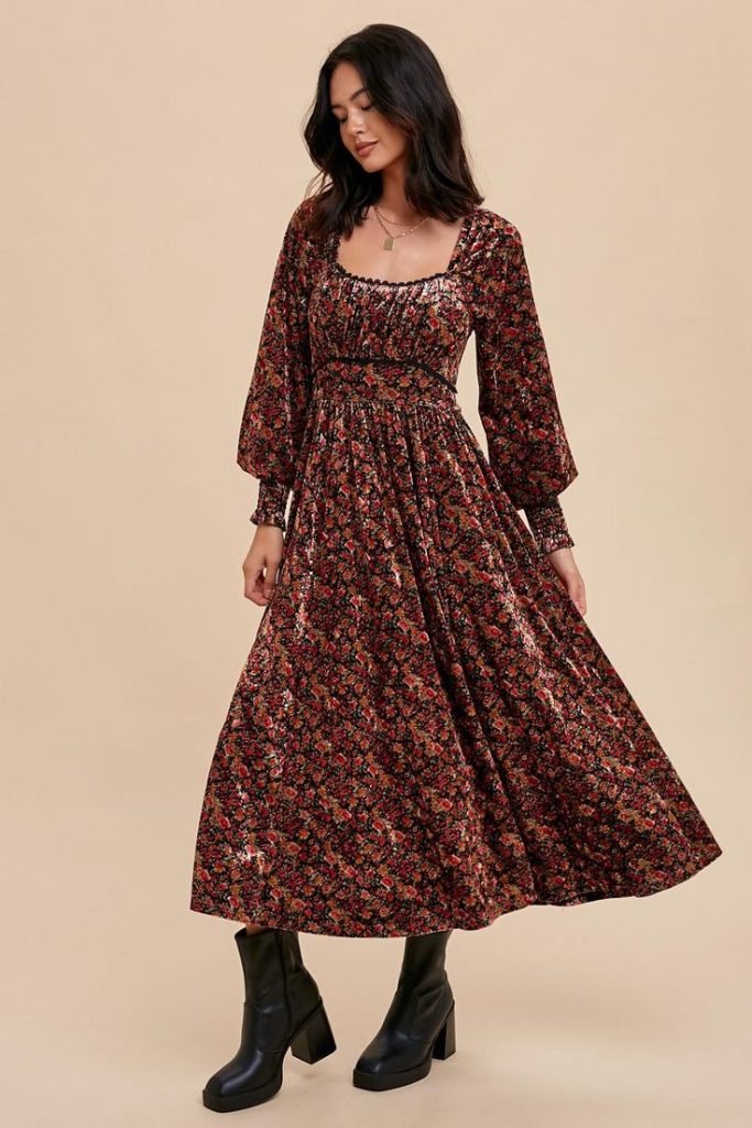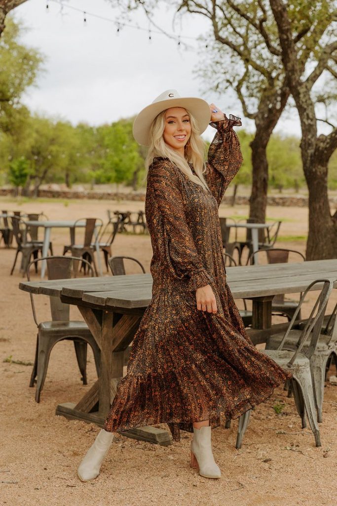 This dress is perfect for those who love a touch of country charm. The dark floral pattern paired with a flowing silhouette gives off a relaxed, rustic feel. The dress’s playful design is perfect with boots for a casual outing, whether you’re attending a fall festival or a casual outdoor gathering. Add a felt hat and some statement jewelry to complete the look.
