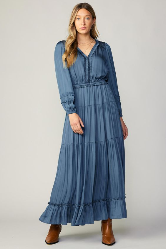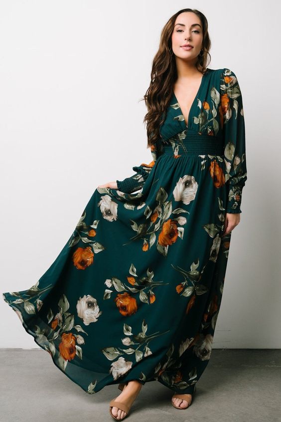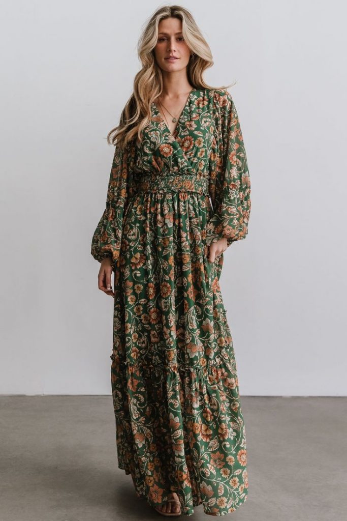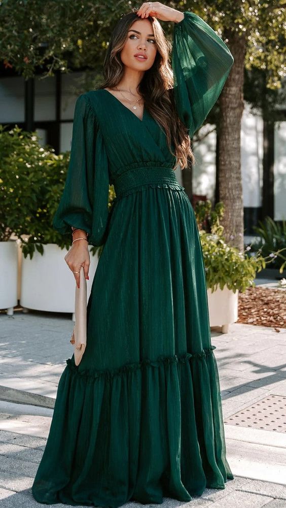 This dress in a stunning deep green hue captures the essence of fall elegance. The flowy fabric and bishop sleeves add a touch of drama, making it an ideal choice for pictures or formal gatherings. The cinched waist enhances the silhouette, while the floor-length skirt exudes grace. Pair it with boots for a chic outfit that’s perfect for evening events or a romantic dinner.