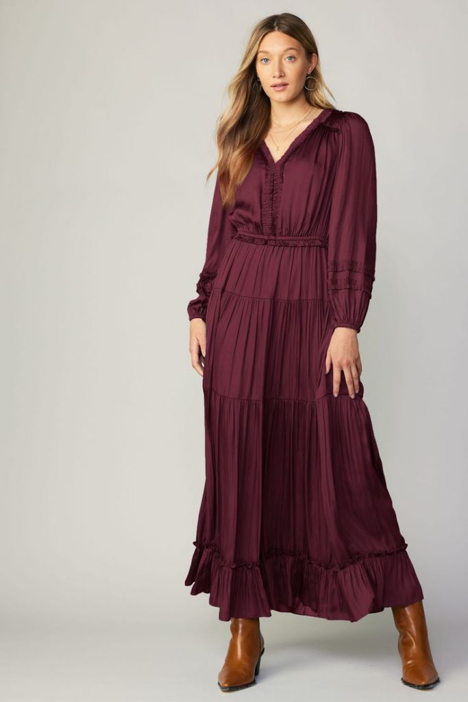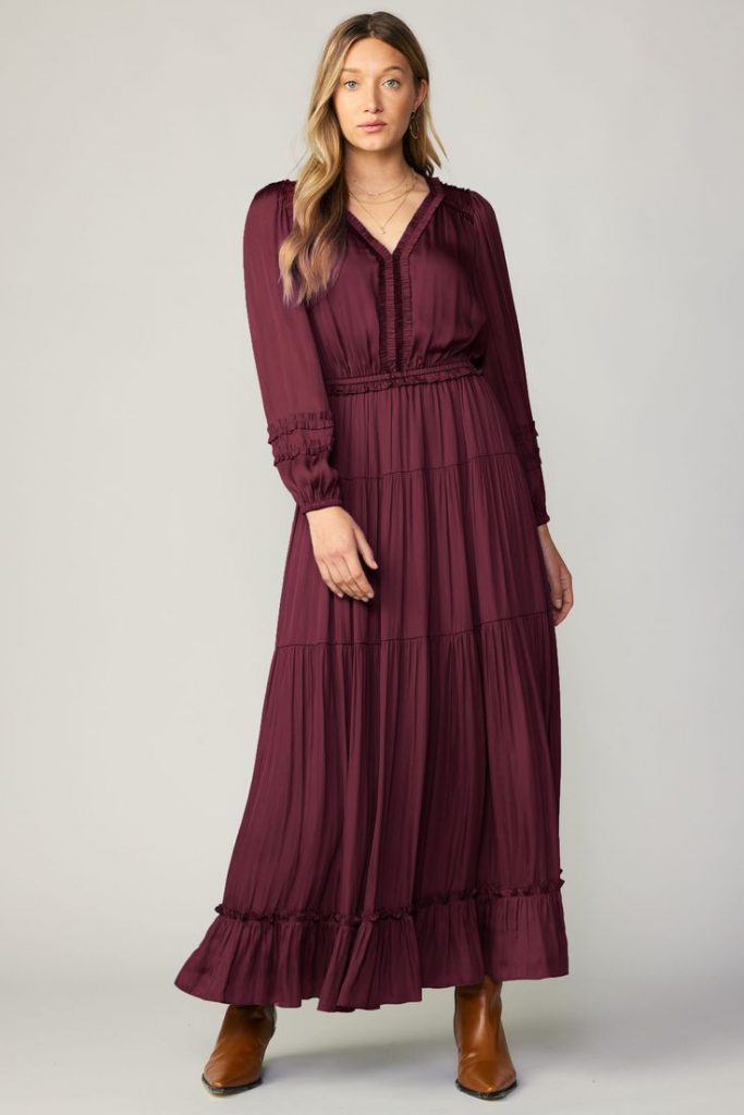 Burgundy is a quintessential fall color, and this dress embodies the season beautifully. The tiered design and subtle pleats add movement and grace to the outfit. This dress can be dressed up with boots for a casual day out or styled with accessories for a more formal event. The simplicity of this dress makes it versatile and timeless.