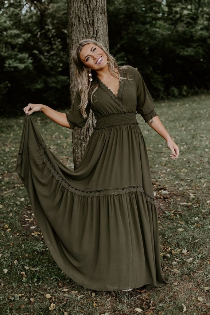 This olive green dress is perfect for embracing the earthy tones of fall. The soft, flowing fabric and lace details add a feminine touch, making it ideal for pictures in an outdoor setting. The dress can be paired with boots for a casual look or styled with delicate jewelry for a more polished appearance. It’s a great choice for a relaxed weekend outing or a casual date night.