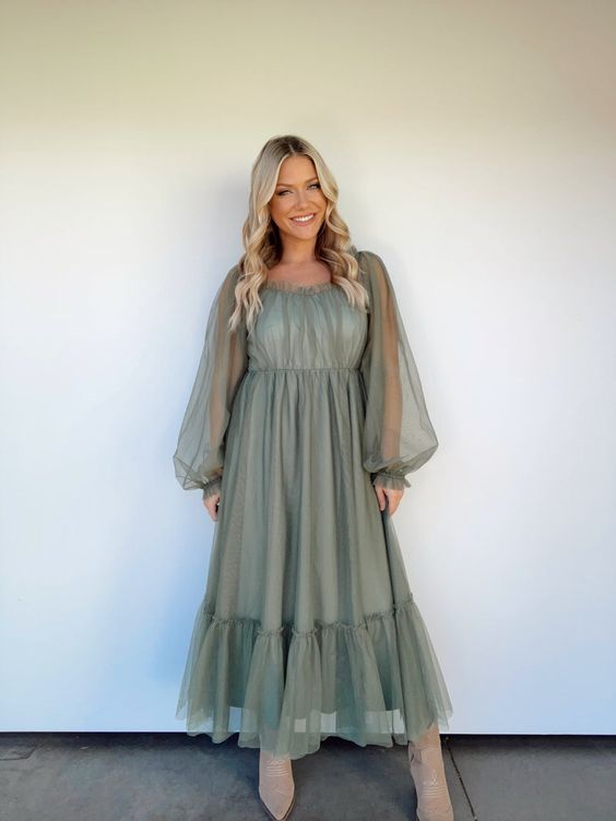 This sage green dress embodies a light and airy aesthetic, perfect for a serene autumn day. The sheer sleeves and tiered skirt add a delicate touch, making it ideal for both casual and formal settings. Pair it with boots for a chic daytime look or with heels for an evening event. The soft color and flowy fabric make this dress a versatile piece for your fall collection.