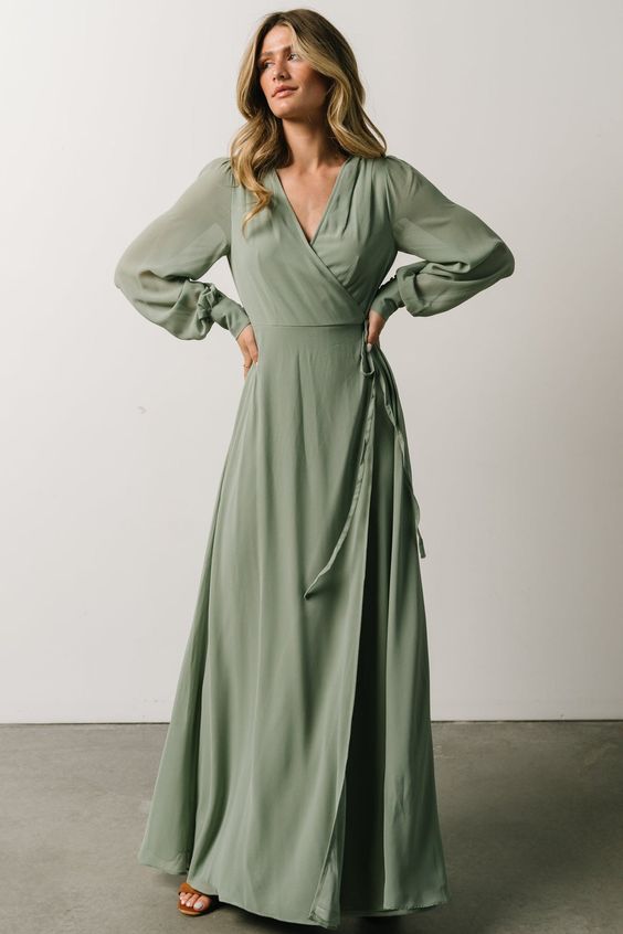 This elegant wrap dress in a soft sage hue is perfect for a sophisticated outfit. The wrap style is universally flattering, accentuating the waist and creating a graceful flow. The long sleeves and floor-length skirt make it suitable for cooler days. Pair this dress with delicate jewelry and heels for a more formal occasion, or style it with boots for a chic, casual look.