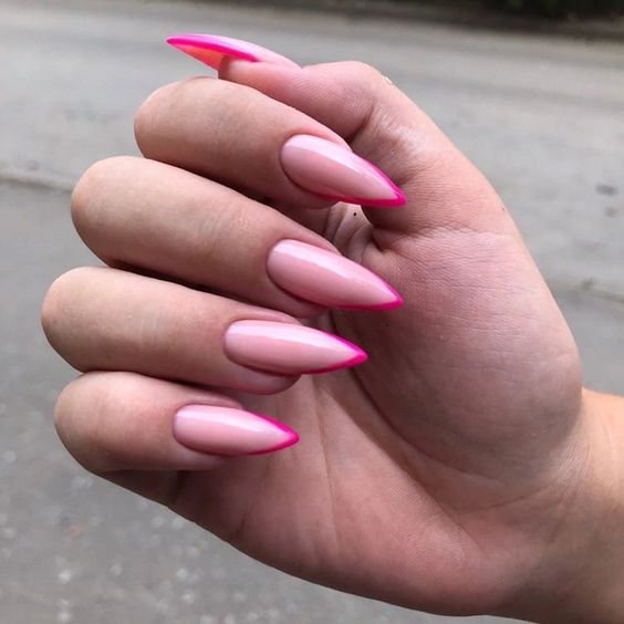 Sharp geometric lines in a vibrant pink hue frame these august nails 2024 almond. The design is modern and edgy, a perfect complement to the bold fashion choices that define the hottest month of the year.