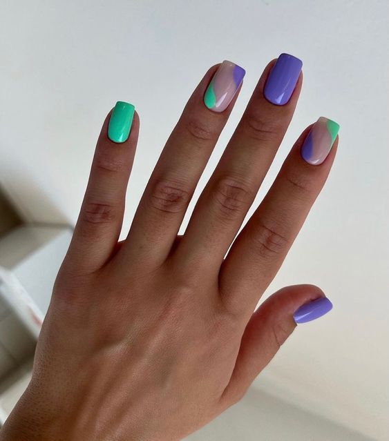 Last but not least, these august nails designs short alternate in pastel green and purple, embodying the colorful variety of August flora. They are a subtle yet striking choice for anyone looking to capture the essence of summer’s end with a touch of grace.
