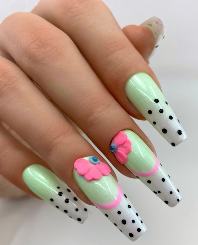 Whimsy meets sophistication in these august nails designs acrylic that play with a pastel palette and fun polka dots. The minty green base coated with a sheer finish provides a refreshing canvas for the white tips adorned with playful black dots. These nails are a nod to the carefree spirit of summer picnics and breezy afternoons, perfect for those who love their august nails designs short with a dash of playful charm.