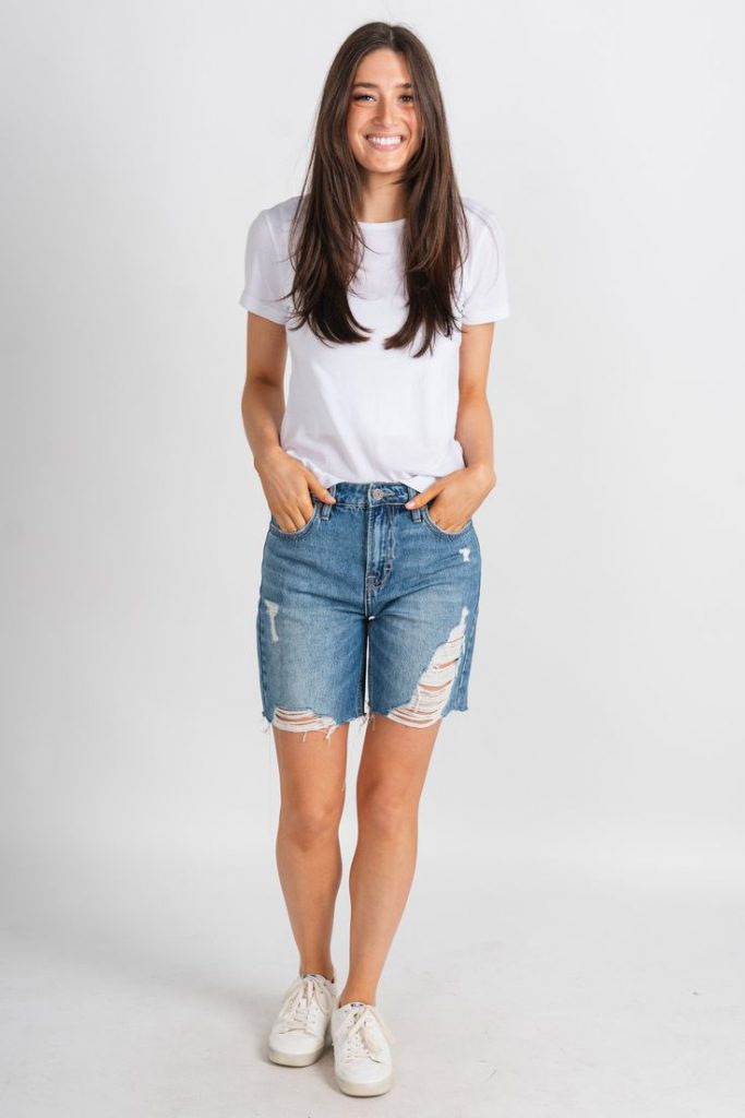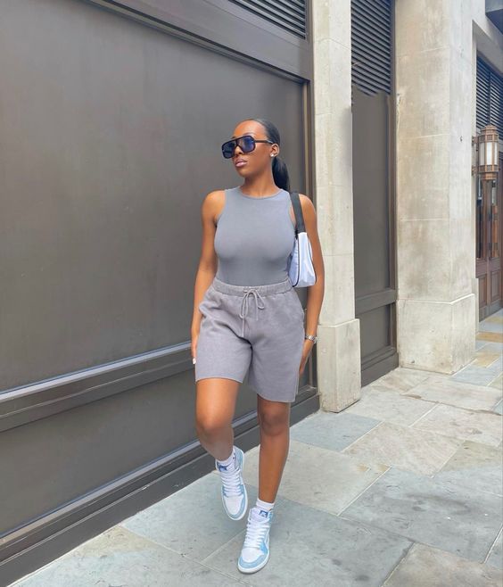 There’s a whisper of nostalgia in this getup, featuring high-waisted, acid-washed denim shorts complemented by an oversized grey top. The look achieves a jean-ius level of comfort with the high-top white sneakers adding a touch of vintage flair. It’s a testament to the timeless appeal of denim in the world of sneakers with shorts women.