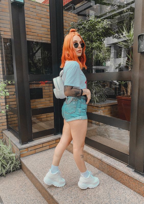 Street style takes a vibrant turn with a bold, orange-haired fashionista showcasing a mix of textures and hues. A soft blue tee layered over a black fishnet top pairs perfectly with high-waisted jean shorts. Light blue chunky sneakers elevate the outfit, highlighting how a Golden Goose-like approach to footwear can add a statement to any summer ensemble.