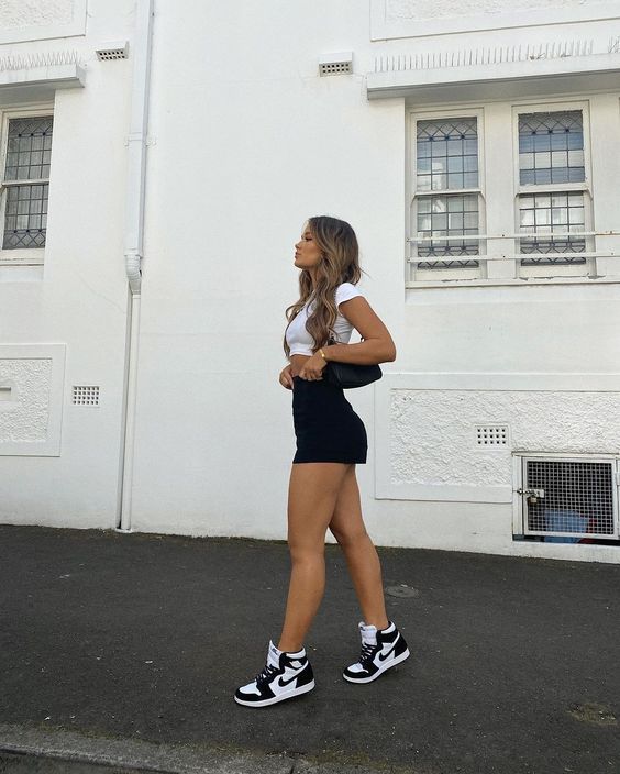 Black shorts paired with a simple white tank evoke a minimalist yet striking effect. The black and white high-top sneakers give a nod to the sport-luxe trend, creating a silhouette that’s effortlessly chic and echoes the versatility of the sneakers with shorts combination.