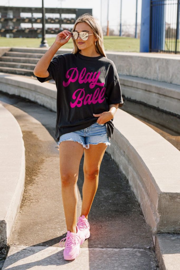 Denim, the evergreen fabric of the fashion world, makes its statement in this laid-back ensemble. The frayed denim shorts bring a rugged, biker edge, softened by a playful ‘Raising Ballers’ white sweatshirt. Paired with pristine white sneakers, it’s a nod to the casual staples that never fade from the summer scene.