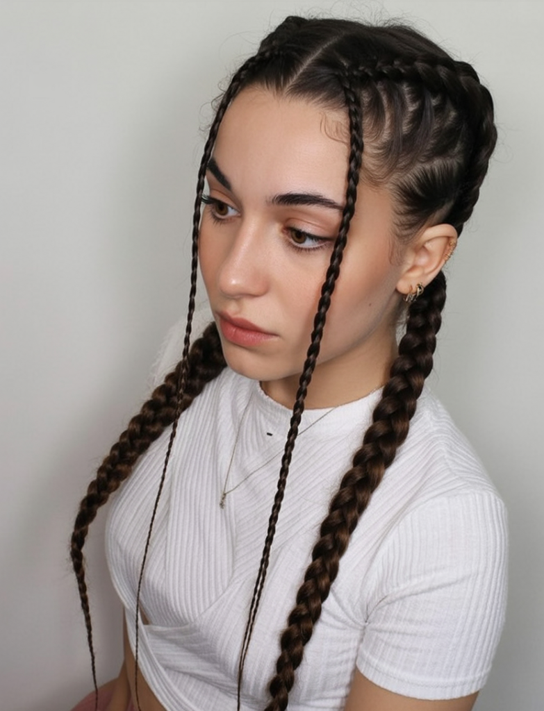 Something so young as a pair of buns is even more impossible to resist when they are combined with thick, daring braids. This is a protective hairstyle that is both structured and lively, creating an energetic feel that is both sporty and stylish. It is ideal when a woman wants to add some personality to her appearance.