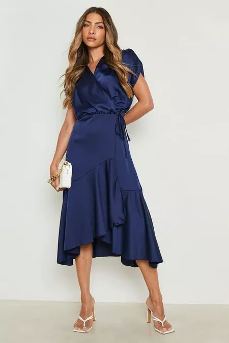 10. Navy Blue Satin Wrap Dress: Timeless Transitions