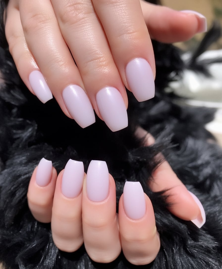 If you’ve been tempted by trying purple but don’t want anything too crazy, then these cloudy lilac nails on shorter coffin nails are actually a pretty great middle ground option. The color is pale and ethereal, kind of like sunlight on a spring morning, and combined with this matte effect, there is actually a pretty cool and updated look that gives this classic color a pretty cool and modern spin that is still pretty feminine but just rebellious enough that it could be considered pretty on-trend for any corresponding design choices made for nails within 2026 confines and applications. Pastel lilac and lavender colors remain big when it comes to nails, and as a shorter coffin shape, this one especially has a certain sophisticated elegance that looks fabulous as you’re getting away from boring pink nails and looking for a more interesting alternative that still coordinates well with denim, neutrals, or bright red and green statement items in your wardrobe. You can actually keep your overall look pretty basic, from a natural makeup look to a nude lip color, and just have this nail trend as a pop of something on point and on trend that gives a nod towards what is new and fresh without going overboard.