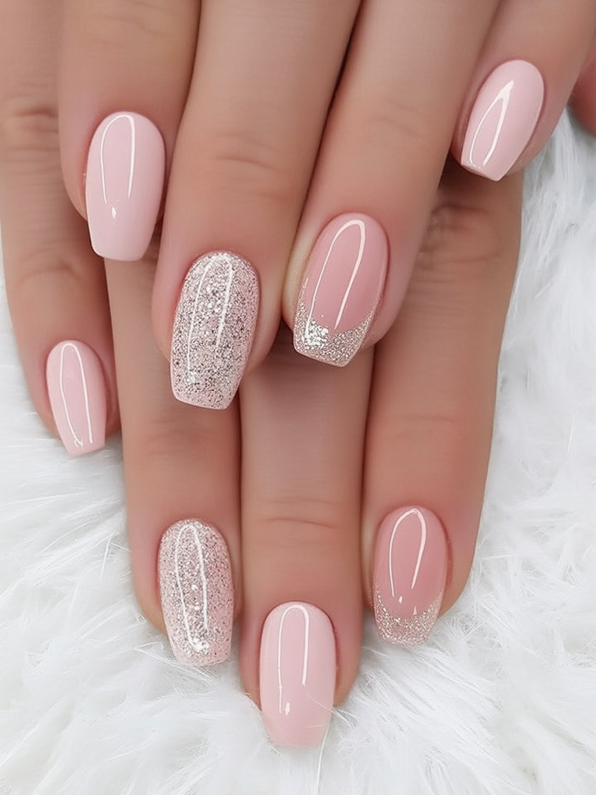 These short coffin nails, alternating between soft pink and mixed glitter, seem custom-designed for parties, whether big or small. They’re beautiful enough for a wedding or party and still laid-back enough for jeans and a tee, and they’re perfect if you’re into some pretty feminine and slightly more than just basic ideas that aren’t enough on their own but just have that certain little something and some substance as well.