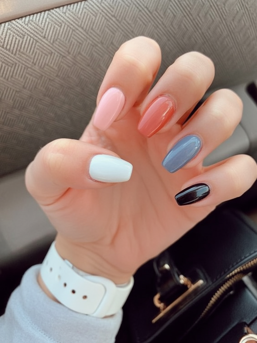 This rainbow pastel set is a perfect way to turn your short coffin nails into miniature mood boosters themselves, as they feature every finger having its own color that is just as bright and just as bold and begging for serious attention—pastel pink, pink, blue, and then finally deep black and matte, because why not, right?