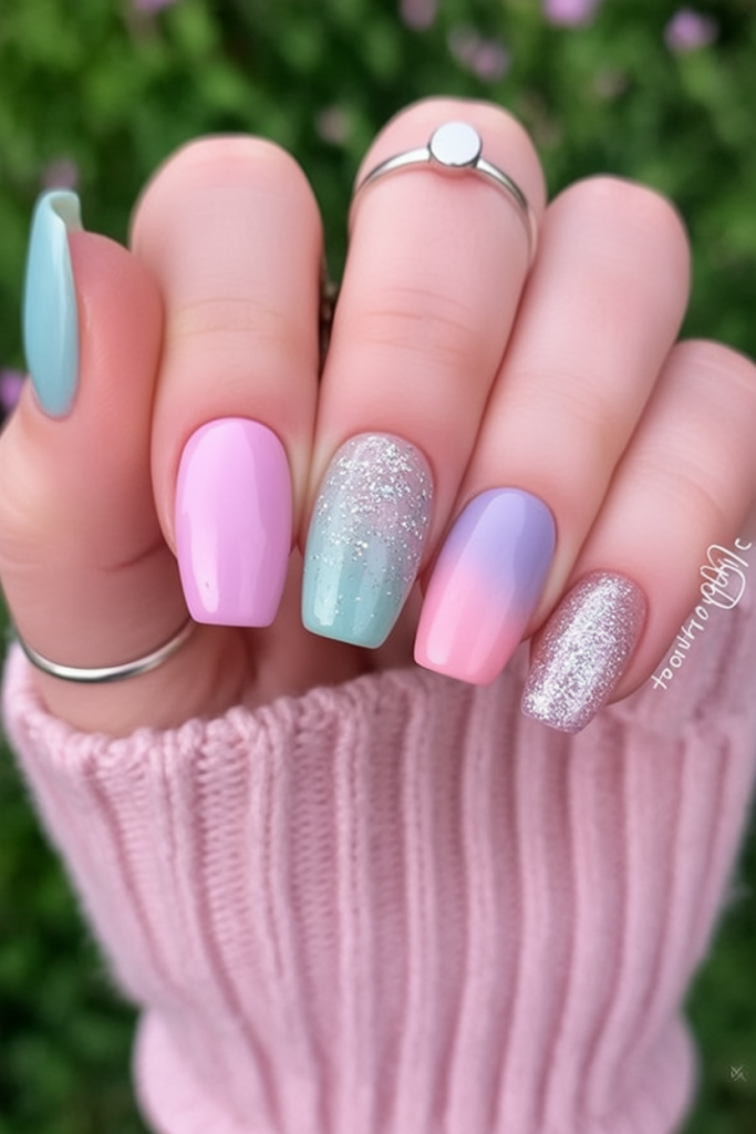 Ah, these coffin nails are just about as precious as opening up a small box of candies because spring is near, and these include no fewer than four colors—mint, lilac, baby blue, and bubblegum pink—because everything shares equal playing time, and this one sparkly nail brings everything together as if thrown into a celestial party of tiny, shining stars that twinkle and sparkle and dance under the light just because one nail art is going all artistic on this trend!
