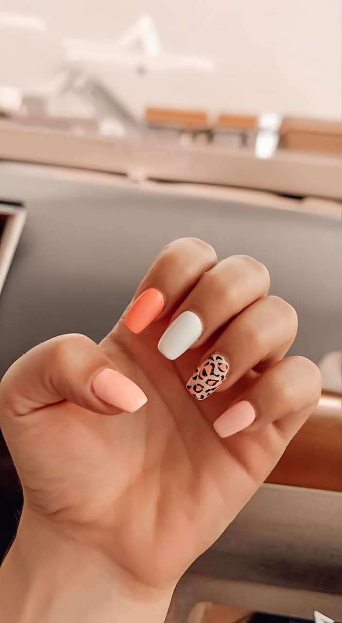 These short coffin nails are just an absolute blast and feature a fabulous mix of peach pink, bright coral, clean white, and leopard that ties all of these colors together. There is just something about this mix of colors that screams weekend adventure, and this is exactly what this pair of nails captures—it’s bright, bold, and just a little bit crazy, and it’s all just a weekend adventure translated right onto your nails, because this is just what this design is all about—it’s bright, bold, and it has some serious character, and the leopard skin helps mix this up and prevent this design from getting too boring by being all one solid color, because that would just be way too gimmicky and more than a little tacky, especially on all of these different colors combined, because this is just a fantastic way to rock some leopard