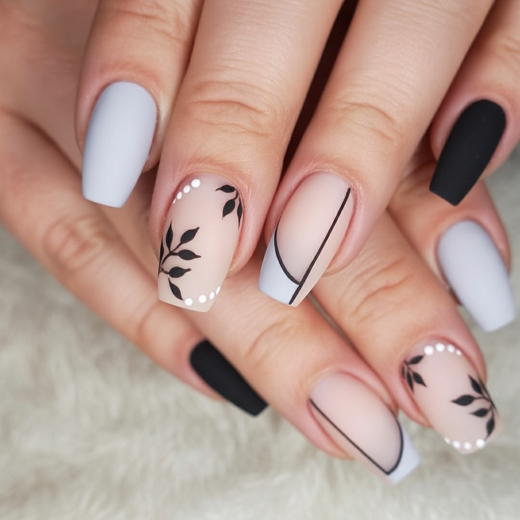 Here’s a quick coiffure design when you need something more artistic than, say, just a nude-colored polish, but still want it adult and pretty enough for going-out events, especially if they’re more autumn and winter affairs, as this design is all about botanical colors and art, paired with dove gray, nude nails, and some delicate black art of some leaf illustrations and dotted borders, as if it was some small artist sketch book that you get to take wherever you go, and this way, it is one of these pretty designs that shows you have some taste and some artistic eye, when you don’t need much more than that sometimes, as this design is pretty subtle and incorporates enough black accents just for its illustrations and artistic elements that are set into this beauty look, as it still has some pretty great matte effect that hides all of its beauty, because sometimes, beauty is all about going subtle and as natural as it can be,