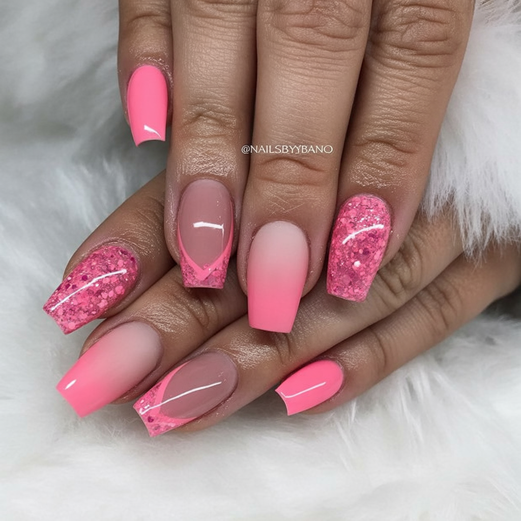 Right now, hot pink is having a major moment as a summer design trend, and this mani is a perfect way to incorporate it into your look for 2026 without going overboard. The way that this mani combines a sheer base, solid colors, and glitter gives the nails a dimensional, glamorous look that is especially flattering on a short coffin-shaped pair of nails, and this is just perfect for travel, parties, or any other time of year when you want some design inspiration for 2026 that shows you’re ready for some serious fun before you even get dressed.,