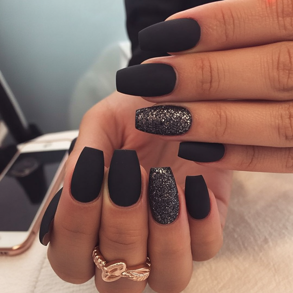 There is just something about having a pair of these ‘short coffin nails done up in deep, matte black that instantly gives you that ‘put-together’ look, as if you’re slipping into your favorite pair of jeans and putting on a touchdown of a blazer all at once—or, at least, that’s exactly what it does for me! There is just something about this rich, velvety matte that avoids coming across as ‘hard’ or ‘punk rock’ and enters into more of that ‘fierce femme’ realm, as if this one ‘single glitter accent nail is a little ‘necklace for your hand,’ as it were, and that little pop of diamonds is all this look really needs for just that little bit of added ‘flash’—enough ‘flash’ that this mani would be just as at home cradling a cup of joe on a Monday as it would be cradling your glass of wine as