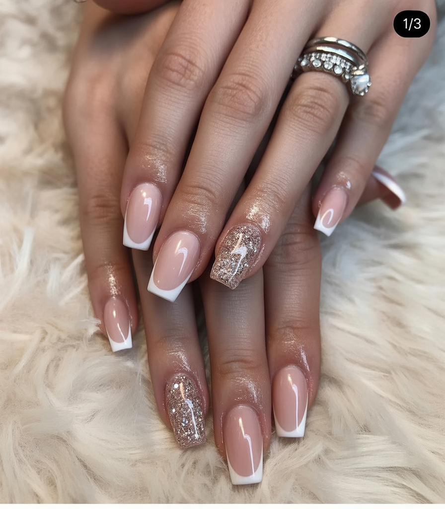 One of the greatest aspects of this design is that it is very low-maintenance, especially for a look that looks as put together as this one is going for. The pink tip helps hide any small chips, and these sparkly nails stay looking great while they’re growing out, which is perfect if you’re trying to stretch your appointments as far as they’ll go. By comparison to other statement red or black tips, this is quite a subtle design that still packs a punch and can be worn all year, whether you’re heading to a Christmas party or a spring shower. It’s a fantastic option if you want a really pretty mani that won’t require constant maintenance changes.