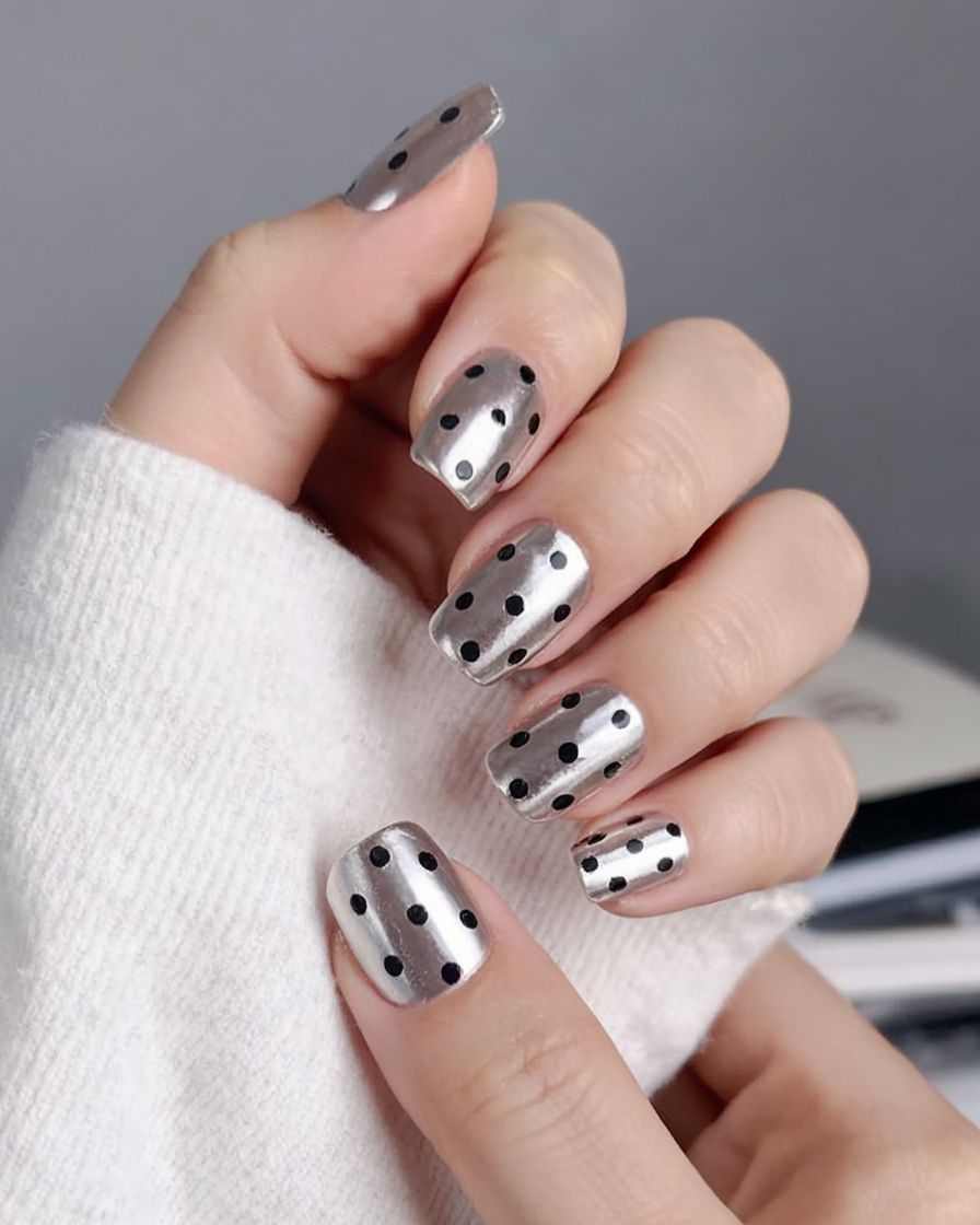 What truly sets this design apart from other choices is its ability to find a balance between being dramatic and simple at the same time. You get that dramatic, eye-catching effect from the chrome, and then there are these tidy little black spots that help it stay organized and graphic—it’s great if you have a thing for black but want something a little more interesting than just a typical flat color. On short coffin nails, this design maintains its clean edge and is ready for whatever functionality comes its way, whether that’s going into a night of dates or just heading into work on Monday morning. Just be sure to ask your technician for a gel and chrome finish on top of your acrylic, and you’ll have nighttime parties and holidays covered with something more sophisticated than bright red Christmas nails.