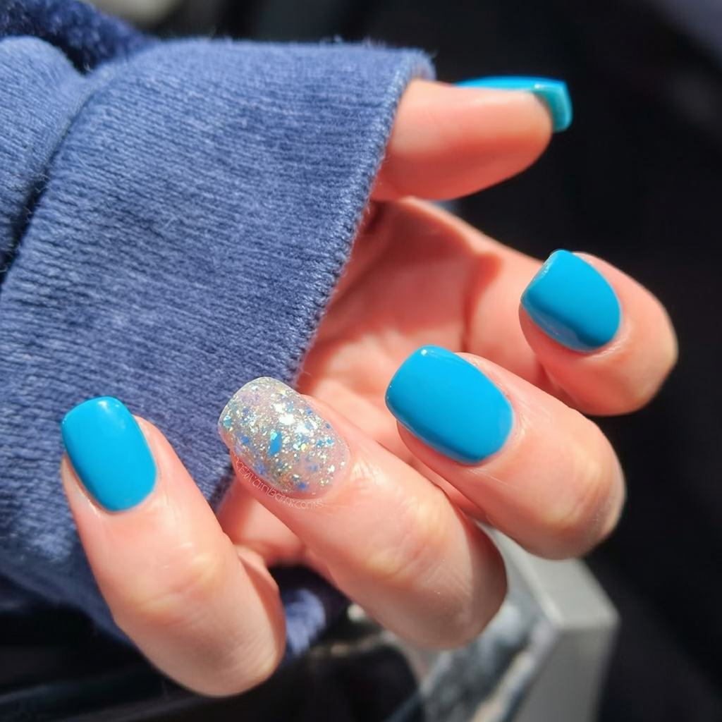 16. Bright Blue Short Coffins With Glitter Accent Nail