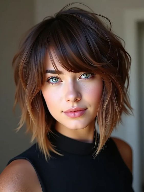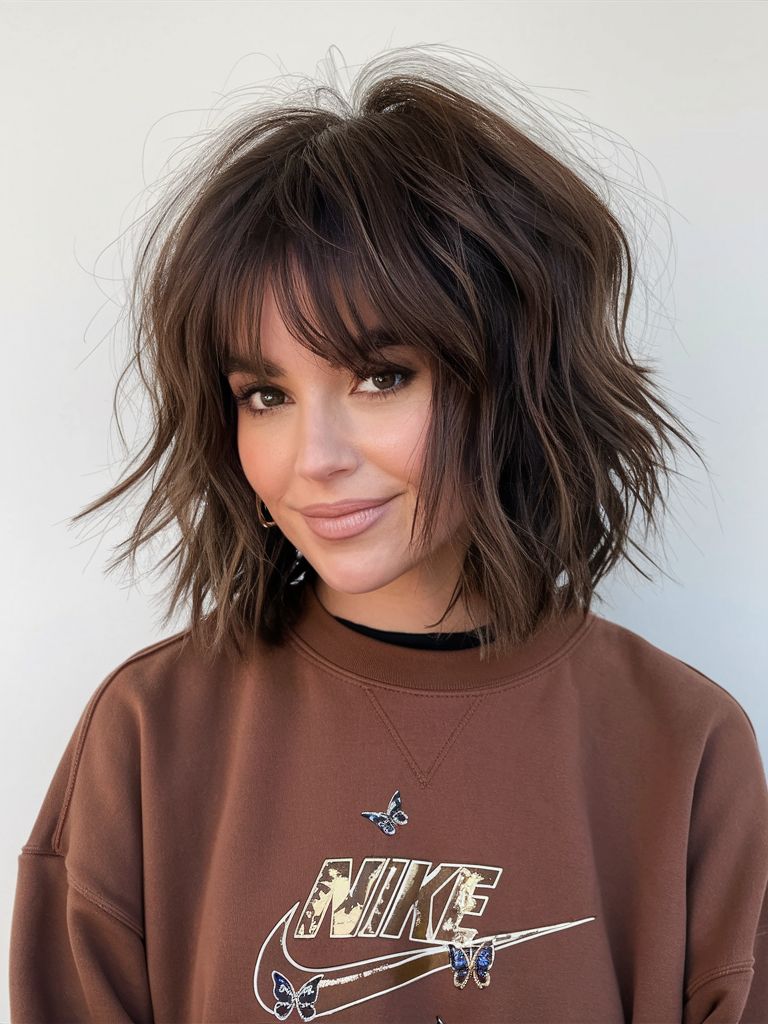 What makes this choppy layered bob special is the way the layers build volume without looking puffy. It’s a smart choice if you want fullness through the crown, especially on medium-density hair. The bangs create instant structure, while the rest stays airy and flexible. Use a texturizing cream on damp hair, blow-dry with a diffuser for natural lift, then pinch the ends to separate pieces. It’s that rare cut that looks styled even when it’s messy.