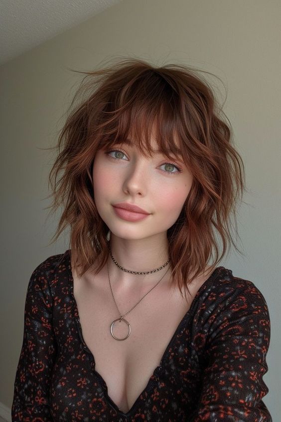 5. Tousled Copper Shag Bob with Bangs