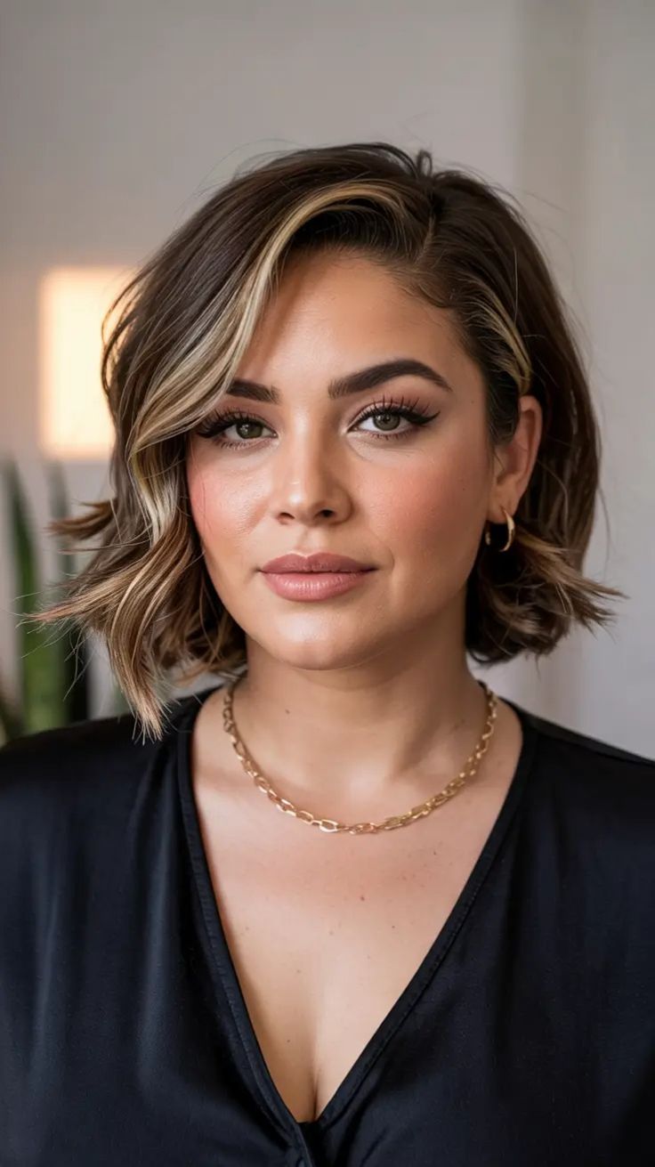 If you’re wondering what to wear it with, think gold hoops, a creamy lipstick, and anything with a sharp neckline—this cut loves a clean collarbone moment. The short layered balayage adds dimension that makes the bob look thicker, which is a win for thin hair. Style with a smoothing cream and a round brush, then tuck one side behind the ear to show off the color placement. It’s a simple combo that reads instantly elevated.
