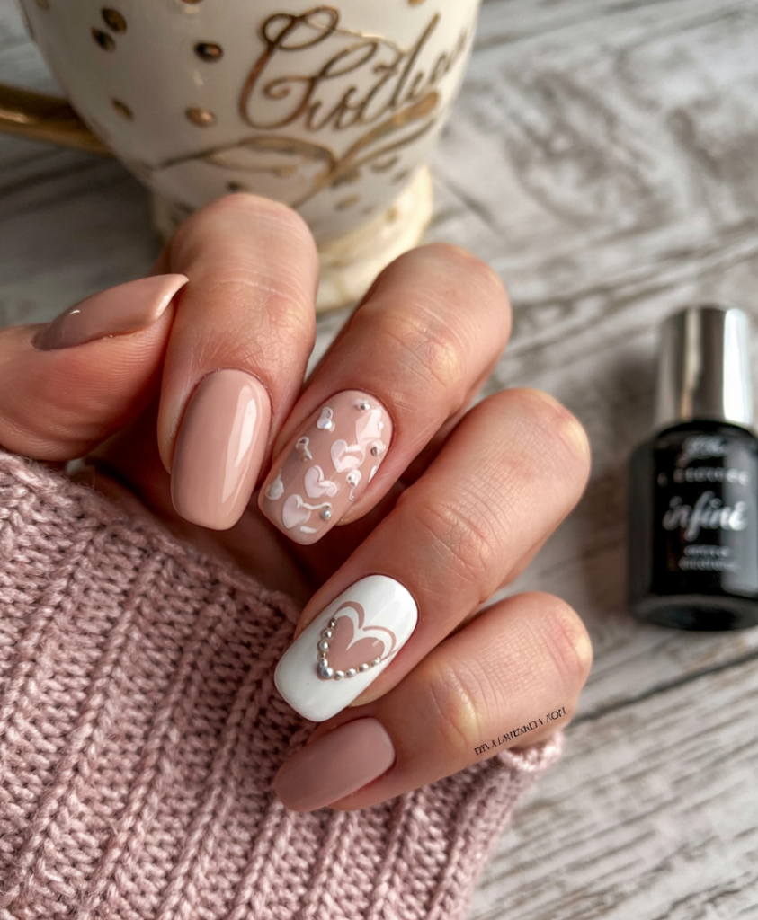 Subtle nude polish is romanticised with pearl accents and white heart designs. It is sweet, fun, and feminine and is ideal during cold winter days when you feel the need to have something gentle.