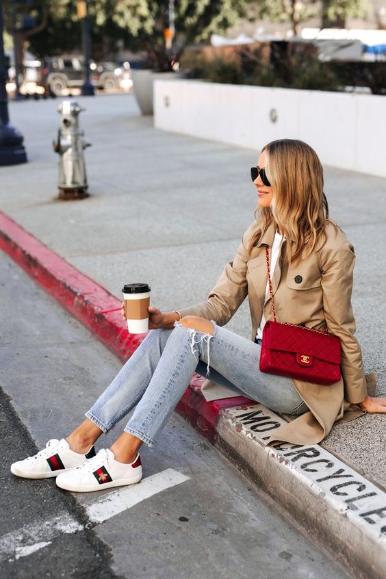 Lastly, we have an outfit that exudes effortless elegance. Light-wash denim and a trench coat serve as the perfect canvas for crisp white sneakers with a touch of color. The red chain bag adds a chic element to this casual ensemble, ideal for a city stroll or a casual business meeting.