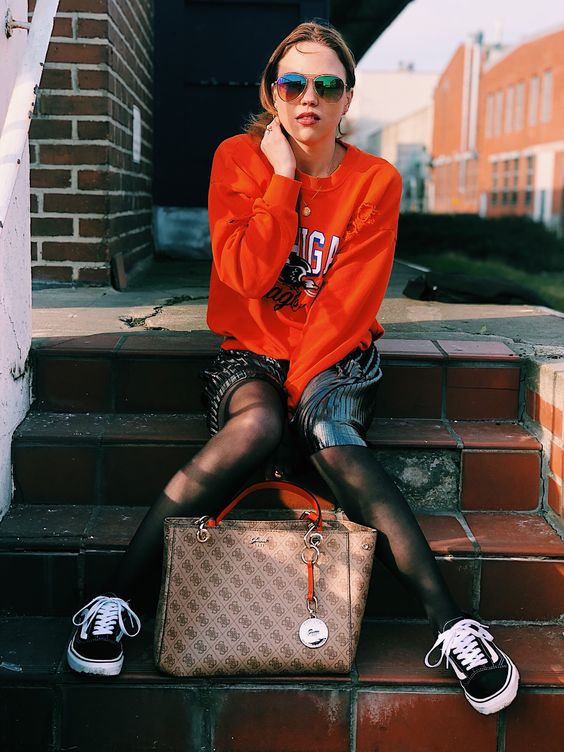 Who says you can’t mix playful with posh? Certainly not the trendsetter sporting an electrifying orange sweatshirt paired with an edgy miniskirt. Black and white sneakers keep it grounded, while a luxury tote swings by with an air of exclusivity. This look is a Balenciaga enthusiast’s weekend dream, proving that high fashion and high spirits go hand in hand.