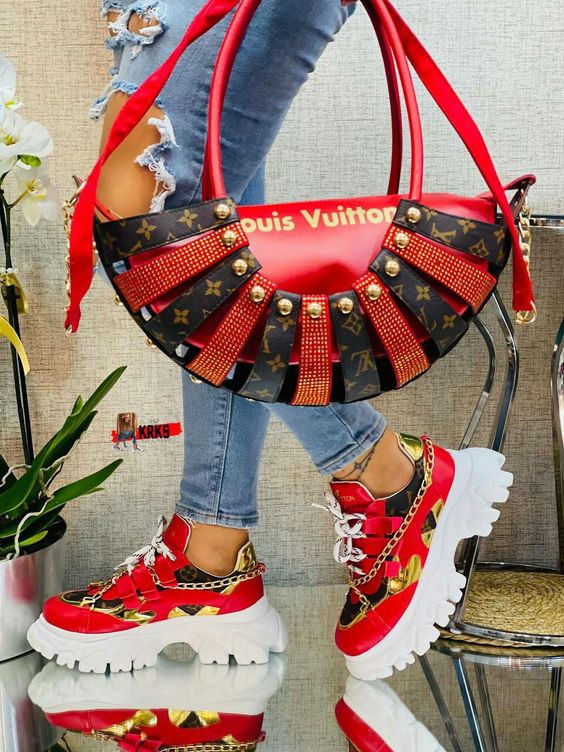 For the crafty and creative, behold a Diy masterpiece – sneakers customized with flair, paired with luxury denims. The bag? A red-hot, studded spectacle that commands attention. This outfit isn’t just worn; it’s a walking gallery, a testament to those who Carry their art wherever they go.