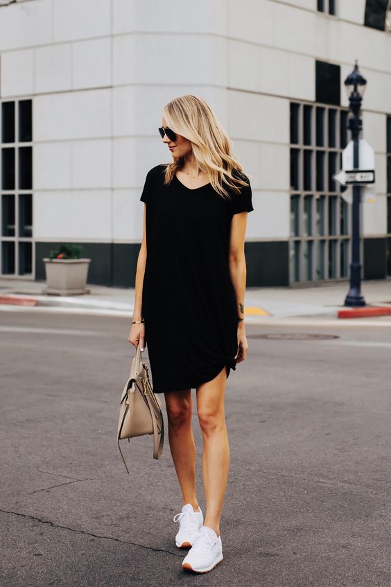 Sleek, chic, and utterly effortless, this look pairs a classic black tee dress with crisp white sneakers. The magic is in the bag – neutral, refined, and sophisticated. It’s the go-to for those who love to look put together without trying too hard, a perfect blend for Travel enthusiasts seeking Sets of style that move with them.