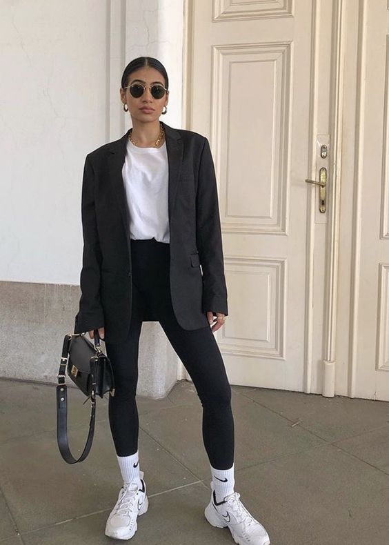 Monochrome finds new depth with this ensemble, blending a structured blazer and Pants with a white tee. Add white sneakers for comfort, a black bag for contrast, and what you have is a power outfit that’s as at home in the office as it is on the streets.