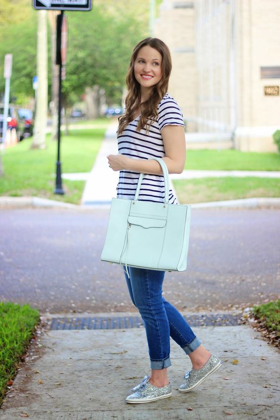 For a look that whispers weekend getaways and seaside strolls, opt for a nautical striped top paired with cuffed jeans. Silver sparkled sneakers add unexpected glam, while a pastel tote bag carries essentials with ease. This casual assembly is a nod to laid-back elegance.