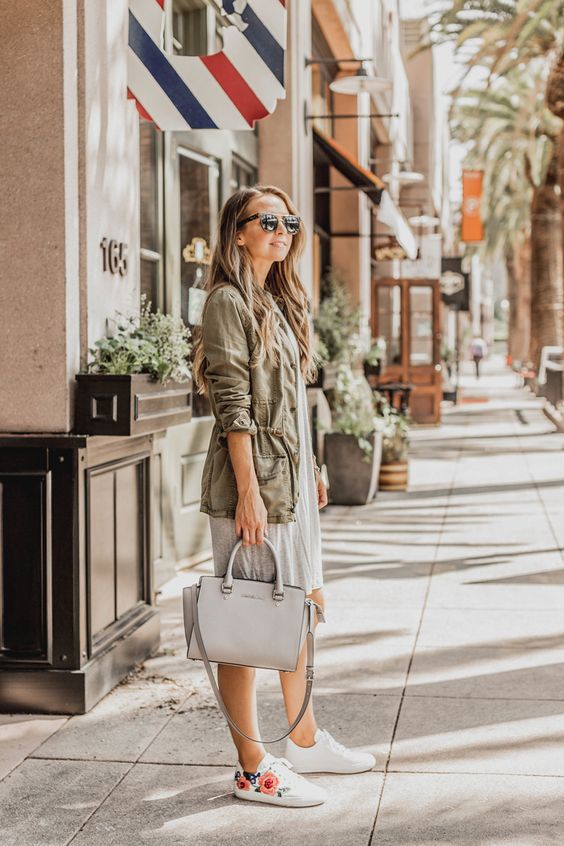 Infuse casual wear with a dash of luxury with this outfit. A flowing midi dress under an olive drab utility jacket paired with embellished white sneakers creates an ensemble fit for the urban jungle. The structured handbag is the perfect companion for a day of travel or a coffee run.