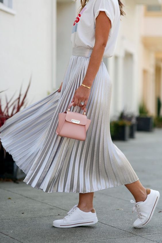 Imagine stepping out in a whimsical pants outfit casual featuring a soft metallic pleated skirt paired with a graphic tee. The look is completed with classic white sneakers and a small pastel handbag, creating a dreamy, modern-day fairytale aesthetic.