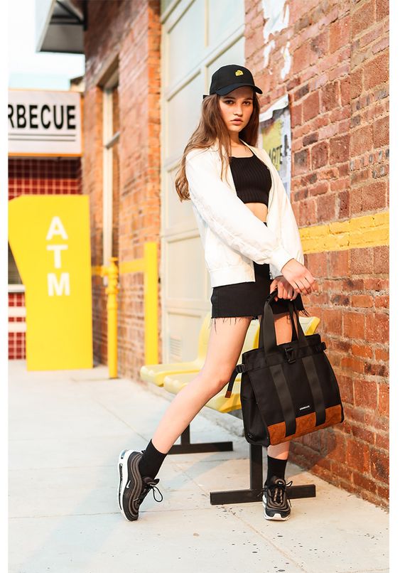 Tap into the sporty-chic vibe with an all-black ensemble featuring a crop top and frayed shorts, elevated with a slick white windbreaker. Black and white sneakers keep the look cohesive, and a large tote bag ensures you can carry all your day’s finds.