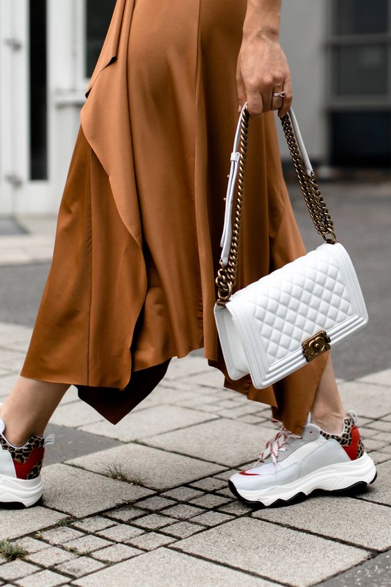 In this outfit, we see a dynamic contrast between the flowing lines of a caramel midi dress and the robust silhouette of chunky sneakers. The quilted white shoulder bag adds a touch of refinement, making this outfit a versatile choice for both leisure and spontaneity.