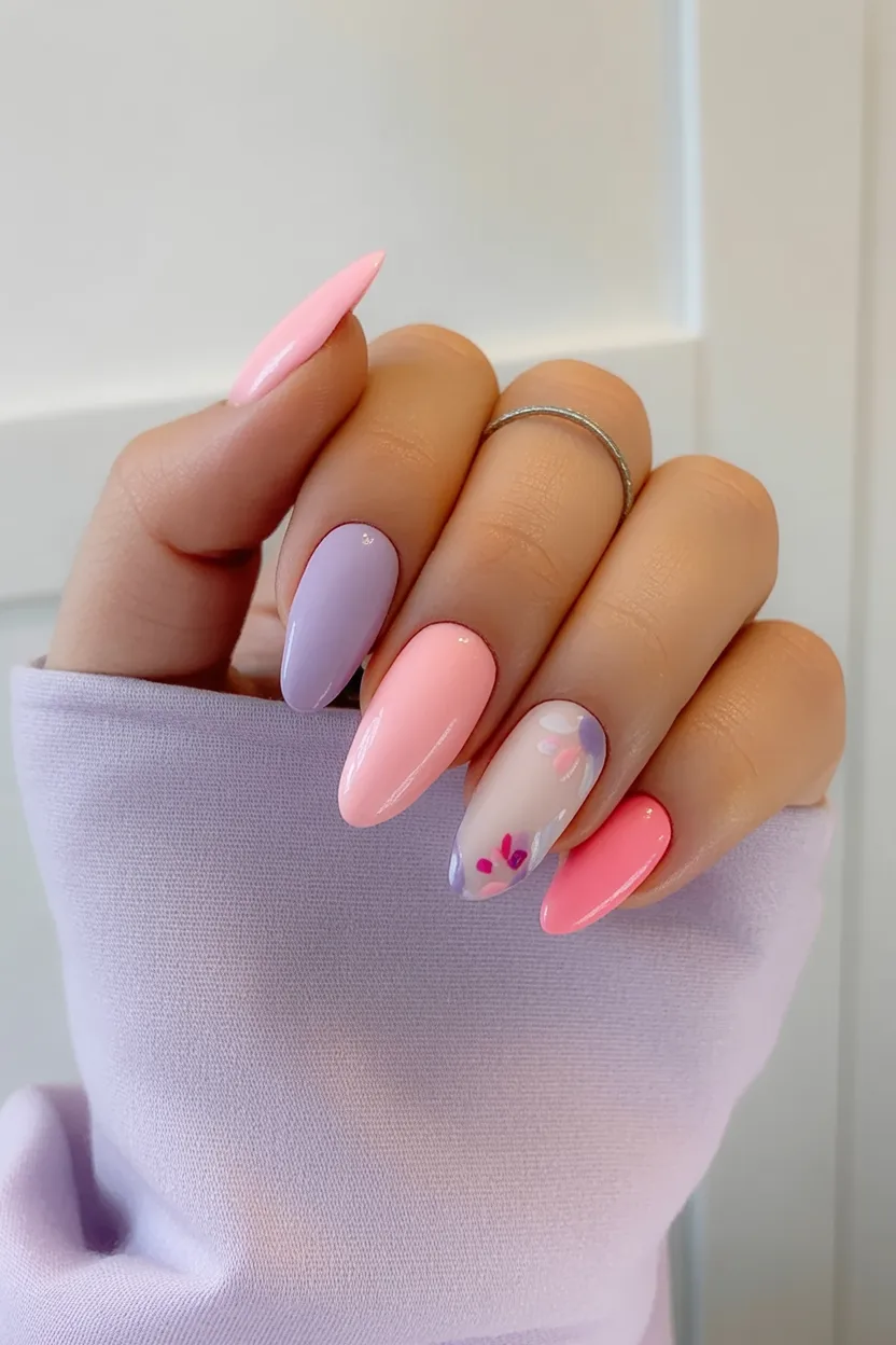 Soft pastel tones always feel right for a spring birthday, and this combination of gentle shades creates a calm, pretty harmony. The blend of pink and Purple feels fresh and effortless—like the first warm days when everything suddenly looks brighter. It’s a manicure that feels relaxed and feminine without trying too hard.