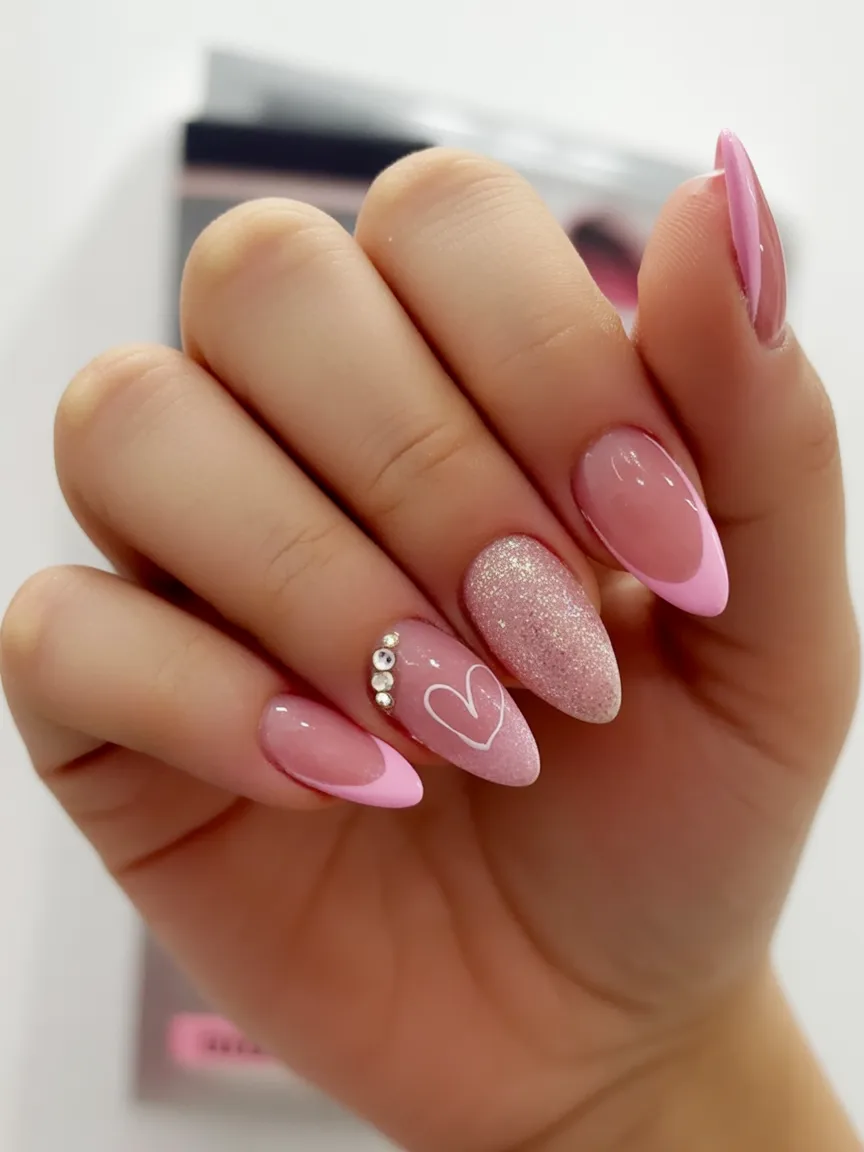 Soft sparkle and tiny heart details make this manicure feel sweet without being over-the-top. The gentle pink tones create a cozy, romantic vibe that feels perfect for a birthday celebration—especially if you love designs that feel personal and cheerful. The subtle shimmer catches the light beautifully, adding just enough glow to feel festive.
