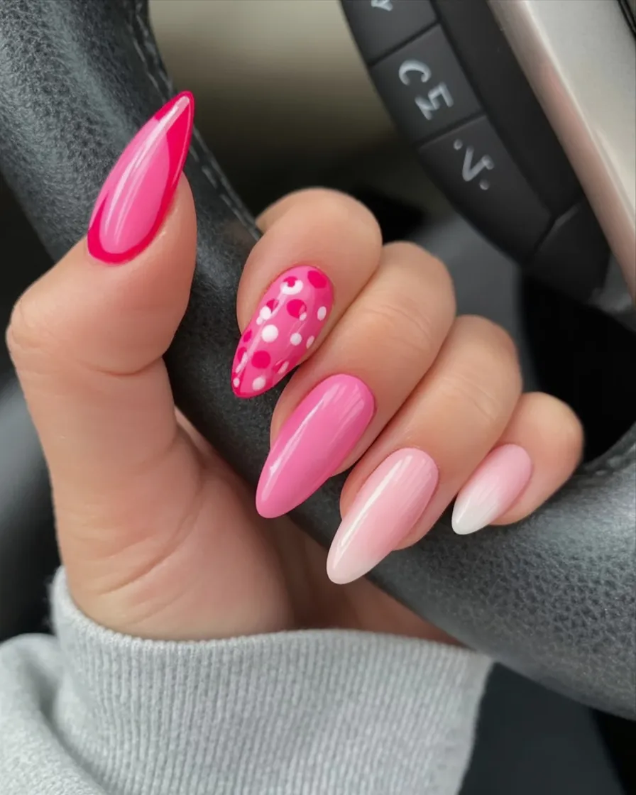Soft gradients and playful dots make this manicure feel like a cheerful birthday treat. The mix of light and vibrant pink shades creates depth without looking busy, giving the whole set a balanced and polished feel. It’s one of those birthday looks that feels festive but is still wearable long after the candles are blown out.
