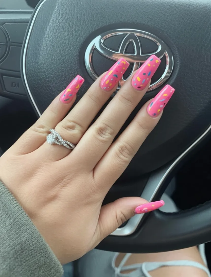 Nothing says “birthday” quite like bright colors and a playful sprinkle pattern. This vibrant pink manicure has an unmistakably festive feel—the kind of nails that make even a quick trip out feel like part of the celebration. It’s bold, cheerful, and impossible to ignore in the best possible way.