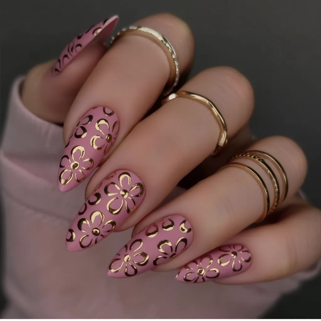 These floral nails feel like a birthday celebration wrapped in elegance. The dusty pink base paired with metallic flower outlines gives this manicure a refined glow that catches the light in the prettiest way. It feels festive without being loud—the kind of design that works just as beautifully at brunch as it does at a dinner party. There’s something quietly luxurious about these Designs, making them perfect if you want your birthday manicure to feel special but still tasteful.
