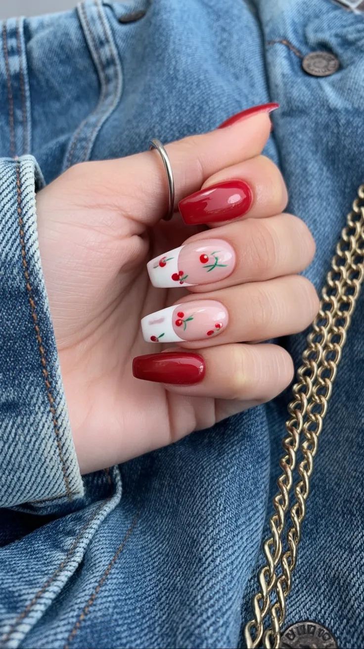 A bold red manicure with delicate cherry accents feels confident and stylish without losing its sweetness. There’s a charming retro vibe here—like something you’d wear with a favorite denim jacket and glossy lipstick for a casual birthday dinner. The mix of bright color and soft artwork creates a balanced look that feels cheerful but still grown-up.