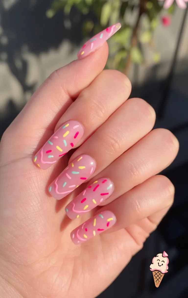 These playful sprinkle nails feel like a tiny birthday party on your fingertips. The glossy translucent pink base paired with colorful accents brings instant joy—almost like frosting on a cupcake. This look has that unmistakable birthday energy that feels lighthearted and fun, perfect for celebrating another year with a smile and a little sparkle.